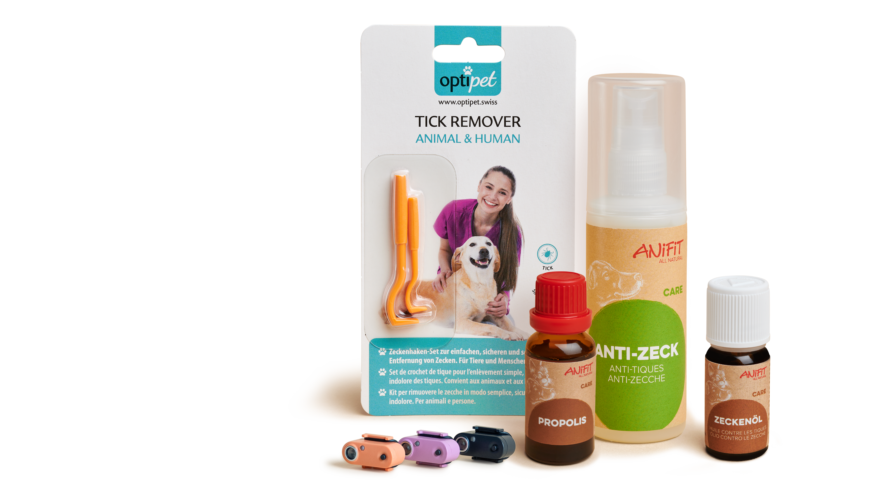 ANiFiT propose plusieurs produits naturels pour protéger votre chien et votre chat contre les tiques. L'huile contre les tiques pour chiens et chats s'applique en externe. Les ingrédients pénètrent dans le corps et agissent de l'intérieur. Elle doit être appliquée régulièrement au début et développe ensuite un effet qui dure plusieurs semaines. Le spray anti-tiques pour chiens s'applique en externe avant chaque promenade. Les Tickless rechargeables pour chiens et chats émettent des impulsions ultrasoniques qui éloignent les tiques. Si une tique mord, l’enlève tiques permet de la retirer en toute sécurité et la Propolis traite et désinfecte la zone affectée.